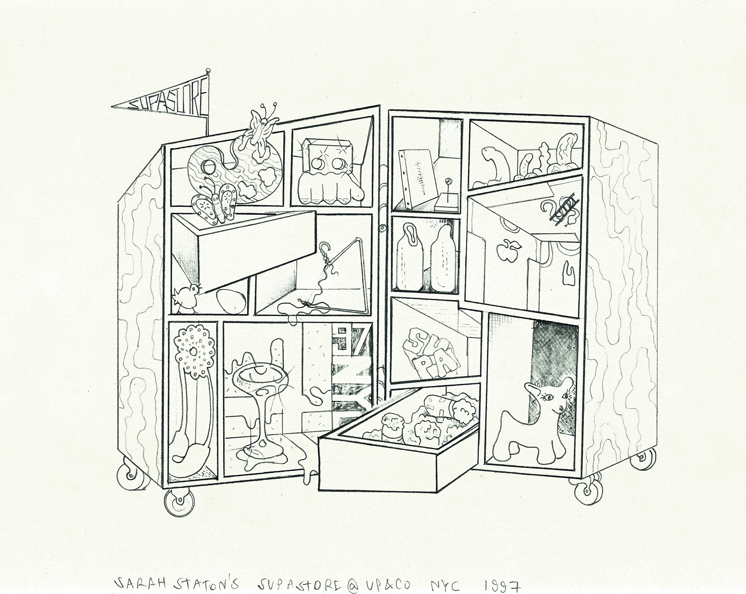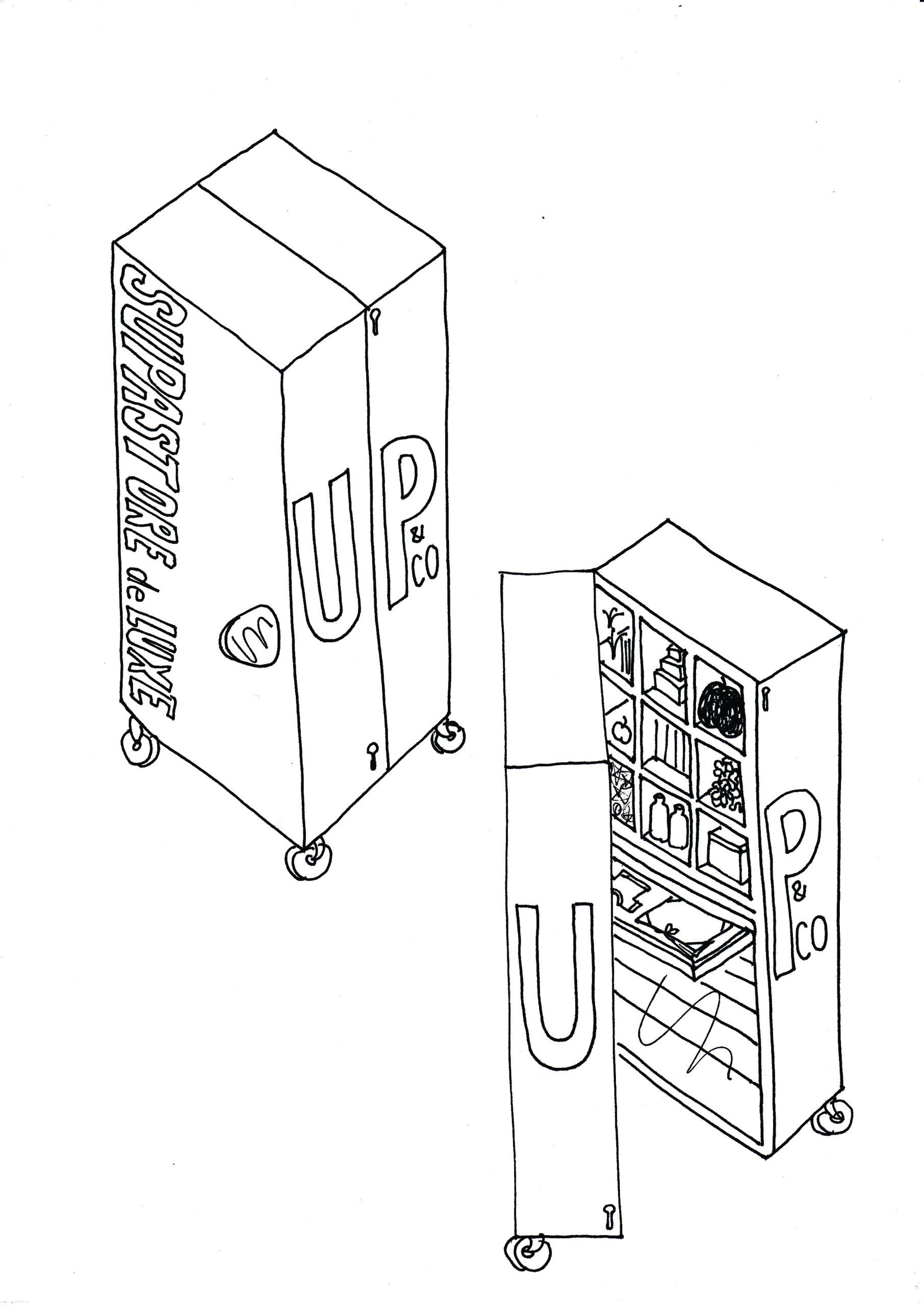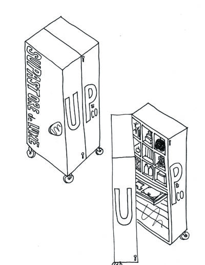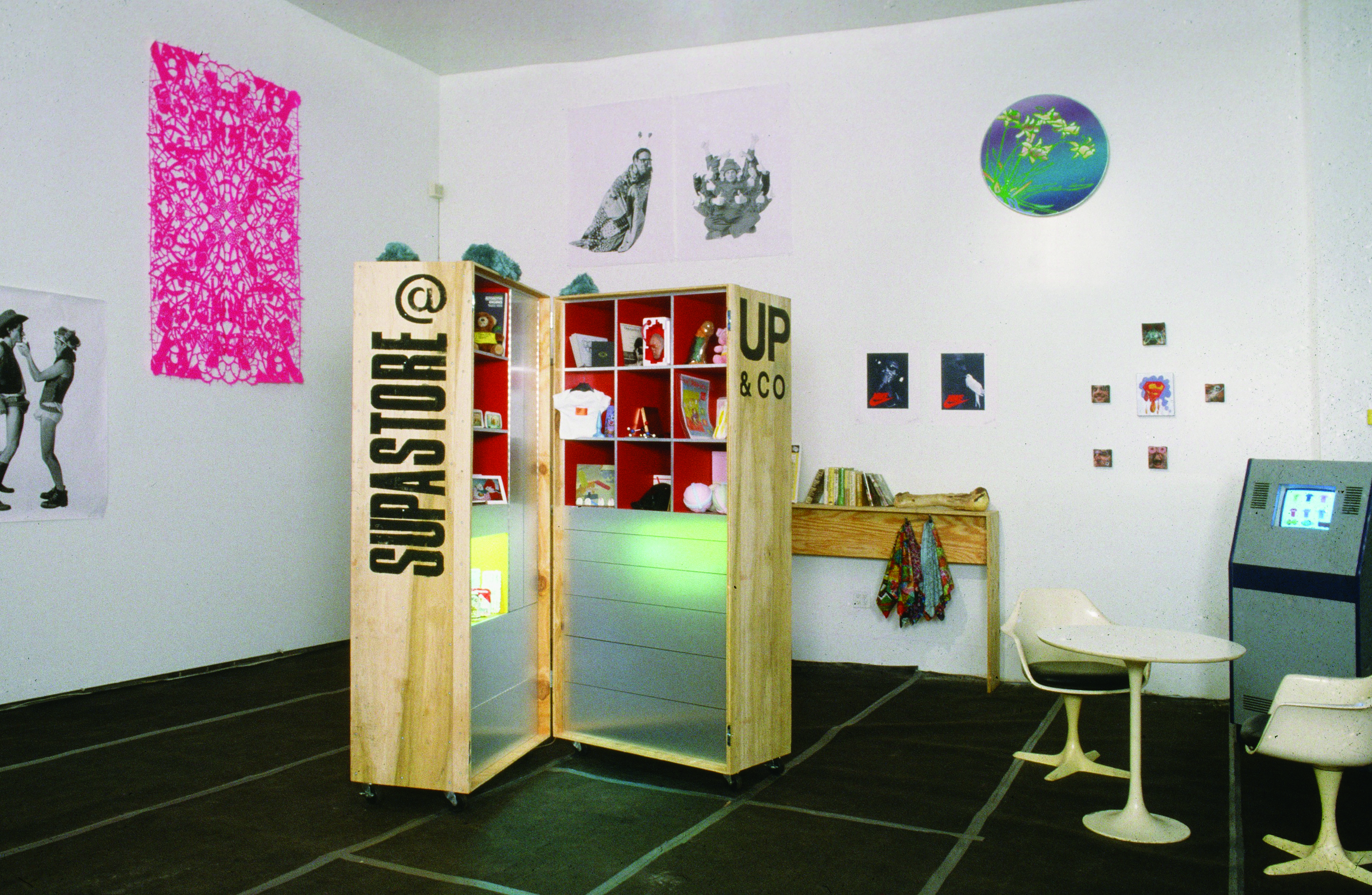One of UP&CO’s early collaborative initiatives was with British artist Sarah Staton’s SupaStore NY, which brought British art and ‘Young British Art’ across the Atlantic. A special SupaStore wood cabinet on wheels, a giant steamer trunk was commissioned by UP & CO and built to Staton’s designs. Over a two year period a series of group exhibitions showcased a great selection of UK art in small format & editions; participating artists included Damian Hirst, Fiona Banner, Nicola Tyson, Tracey Emin, Gavin Turk, Stephen Willats, Simon Periton, with artwork stored in the mobile cabinet between the exhibitions.