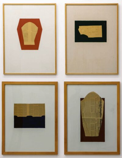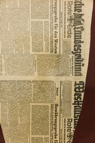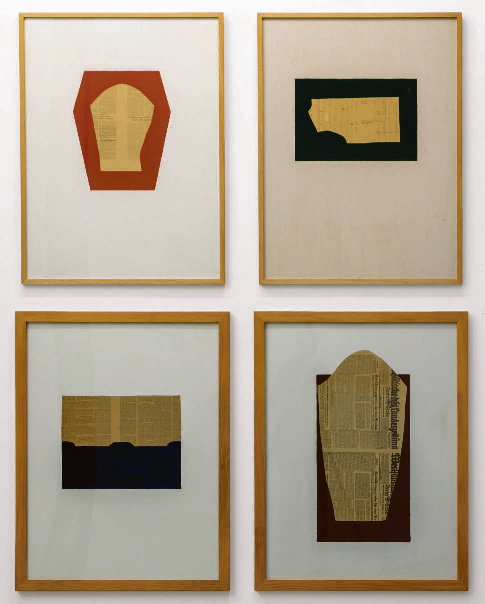 Upon closer inspection however, a centrally placed swastika above the newspaper headline “Rote Erde” (Red Earth) comes to the fore – dated 28 March 1945. The collage elements are now questioned and decoded with horror: “Rote Erde” was the regional newspaper of Westphalia, taken over by the NSDAP as a propaganda newspaper in 1933 and run as such until the end of the war. Translated into visual language, Erinna König‘s “Schnittmuster (Patterns)” series shows how party loyalty and one-sided views were “tailor-made” by the media for their willing readers.