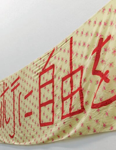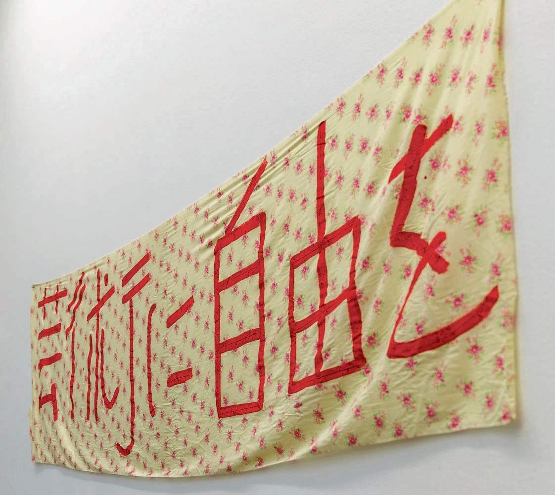 Freedom for Art / Freiheit für die Kunst, banner of floral fabric, red ink writing, Japanese, 1970, Schnittmuster / Patterns series, 1981–90, all works by Erinna König. Exhibition: MIRROR IN TIME, Michelangelo Pistoletto. Erinna König, Opposite page: Greta & Cees, Together, 1979;