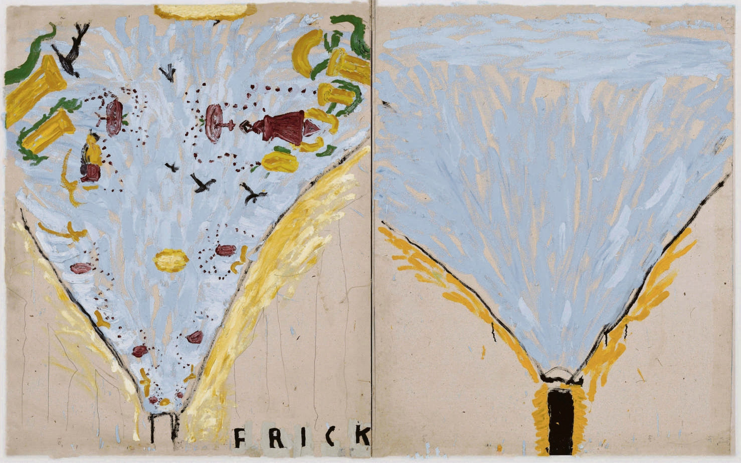‘Frick’ is a striking optical illusion like the Rubens vase which can be seen as a vase or two faces in profile. In Rose’s triptych the three canvases in cobalt blue skies and grey tones can be seen as alley ways in a North African town or erotically as wide open female legs. This is the genius of her work, far more subtle than Rubens’s ‘Vase’, or the rabbit trick image and ‘My Wife and Mother in Law’ by W.E Hill. The imagery is inspired by the recently refurbished Frick Museum where a rococo ceiling fresco has been restored and has the same vivid cobalt blue.