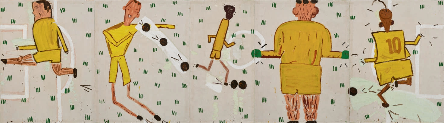 ‘Yellow Strip’ depicts several footballers in movement from different perspectives at the same time, operating in the same way as medieval embroideries such as the Bayeux Tapestry, in which key figures appear more