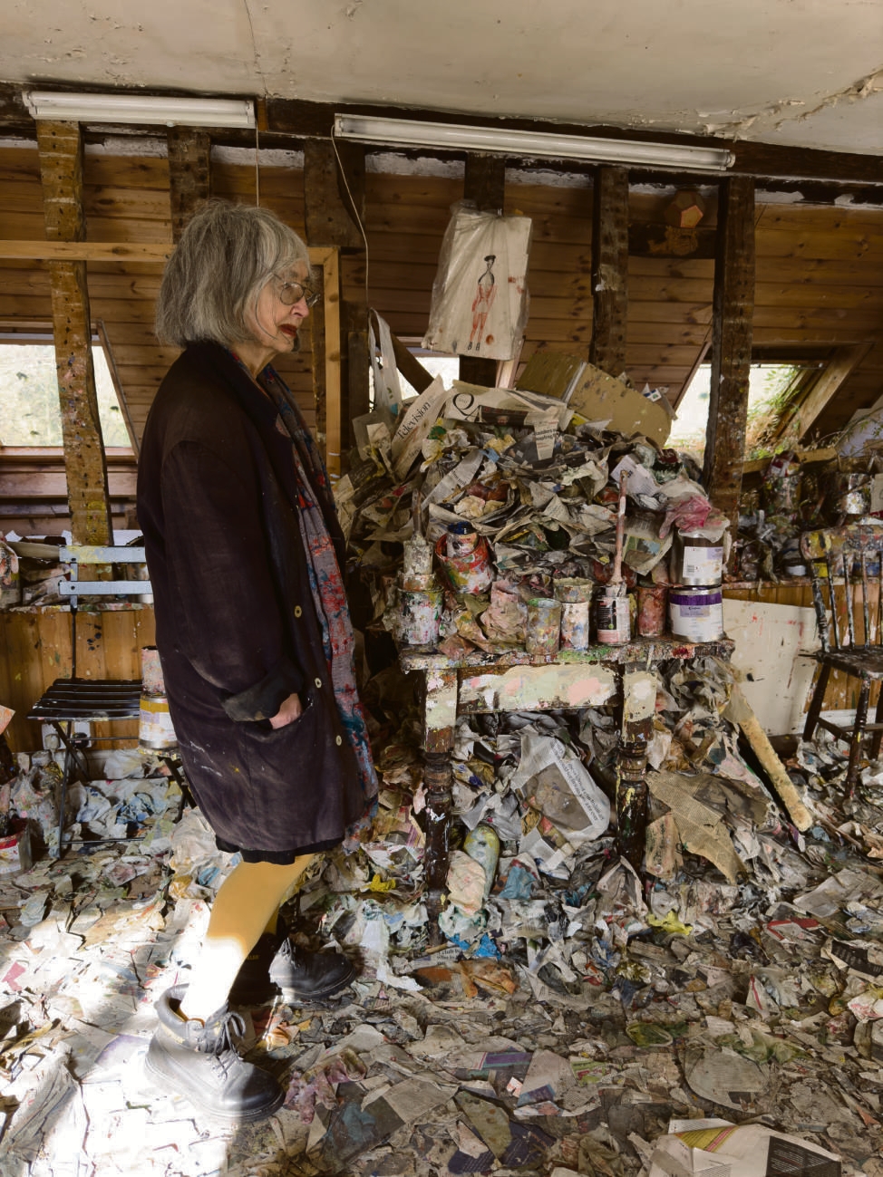 Her expansive canvases cover all the walls in her studio, paint splattered surfaces sing with vibrant colours and the plug sockets are positively roccoco. The studio is a virtual mini mountain range of geological stratae – newspapers, magazines; decades old or from recent days, crustacean shoes, dried up paint globules, paint cans, tubes, rags, dried flowers and a kitsch pink telephone form a gigantic garbage heap so spectacular, a Korean Gallery imported it lock stock and detritus, to exhibit as an installation recently. The mini mountains of tabloids and broadsheets are a stockload of imagery. “I see subjects everywhere, you use what you’ve got.”