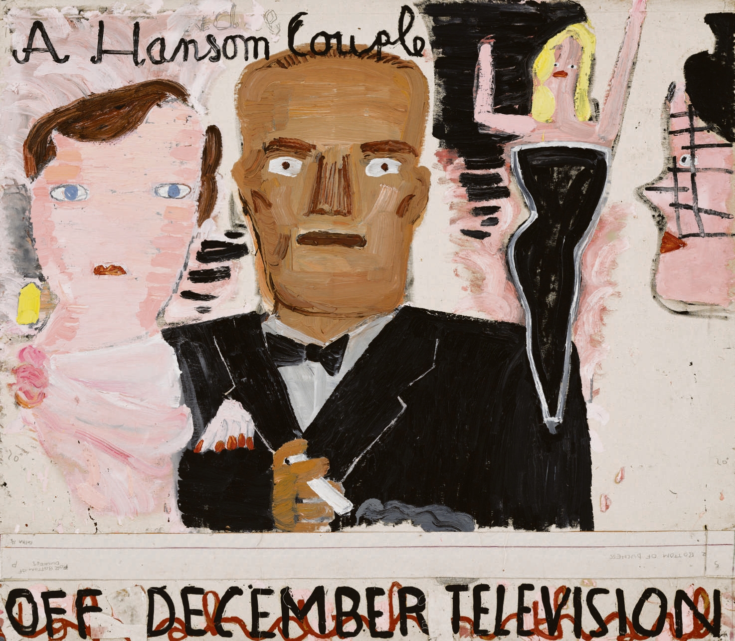Rose Wylie, a prime example of growing old gracefully aged 92, with a bob of ash blonde hair and dark eyebrows, is youthful, with traces of her former beauty. She is inquisitive, staring beneath her dark eyebrows through spectacles, she does not miss a beat. Rose’s paintings form a panoply of the past and the present; memories, from as far back as the W.W.II, painting doodlebugs in a yellow sky, to the present; recent newspaper headlines, fashions and daily life, all rendered in ways accessible to all. Popular culture and history come in to play; portraits range from the Queen of Sheba to the footballer John Terry. Her paintings are immediate and spontaneous and she eschews perspective in a playful witty way and yet one can frequently spot correct Renaissance perspective.