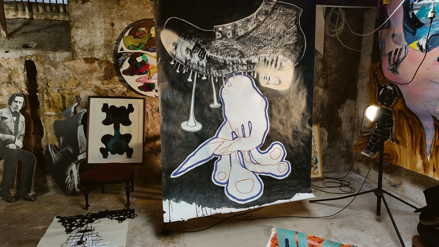 20 x 20cms; Wind at the Naked and the Dead, 2026, 40 x 30 cms. This page: Bread Mountain, baked bread shapes, 1991; Stop Light, 2024, oil and India ink on paper,150 x 200 cms. 2024, Xray Sail, 2018, sail made of real Xrays on boat; Boot and Dead Vida, 2024, 250 x 150 cms, oil and India ink on paper. Studio view and portrait by Tomek Sierek.