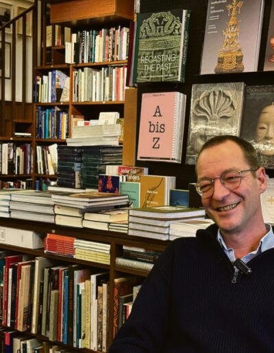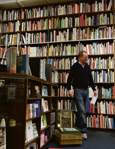 “The internet is a very different medium – browsing the internet or a book is a very different experience. I like both, the internet is so addictive! Our job is that of an editor: we present a selection with our knowledge and make it accessible so you know what’s going on through catalogues, critical theory, architecture monographs. I suspect that the network of publishers is now bigger than they were in the 60s and 70s – maybe the printruns are a bit smaller, but a book is a haptic, tactile object and an edited medium, which brings us back to the job as a bookseller: you edit! The better you edit the better you are which is the same as with a book. It’s also spiritual, it’s good to have books around, they vibrate. At fourteen my daughter reads digitally, but also collects books – it’s trendy to read.”