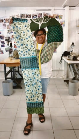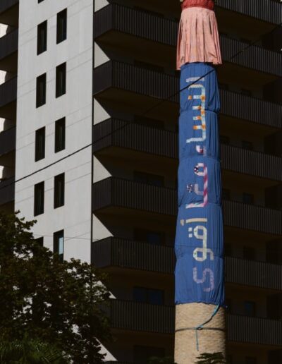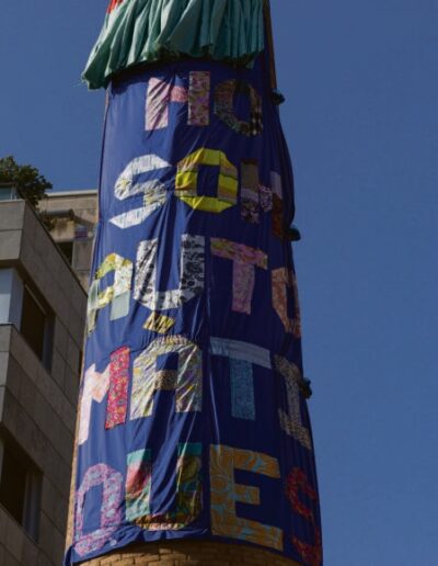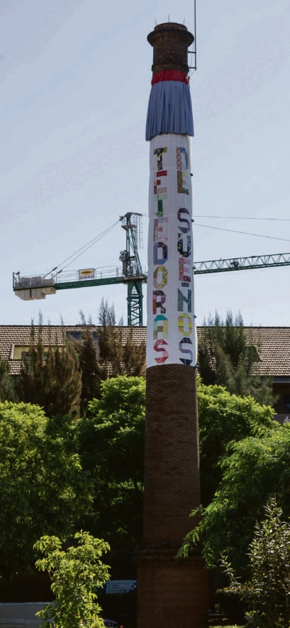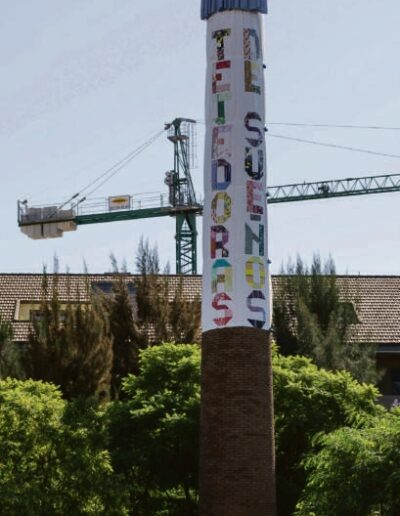 The ‘crown’ of the chimneys featuring a skirt blowing in the wind, banners dressing the stack range from ‘no to racism’ to, in the case of the twin chimneys, ‘women are stronger together.’ Importantly, through the workshops and discussions, the seamstresses themselves decided which phrases to proclaim – and in which language. Thus the installation builds upon the personal and collective stories of local women and their communities.