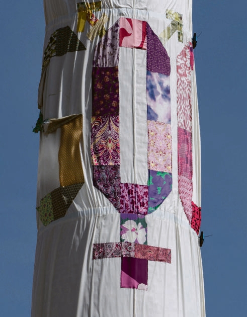 The deepfelt emotional engagement is heartwarmingly documented in the fact that as part of the recycled materials used in the patchwork, bleaching, spinning, steaming, dyeing processes, many women also brought their own clothes and sewing them into the artwork, sent a piece of their own up to the skies over Barcelona.