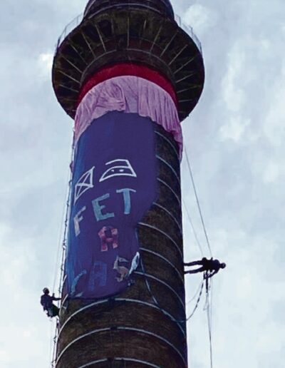 My final installation comprised of 10 of such chimneys in 9 different regions, dressed up and carrying messages in various languages, symbols and expressions. Thus we brought the past with all its colonial and capitalist exploitation connotations to the present time and were able to convert these ginormous fallic symbols of a historically patriarchal system into billboards for female power and expression.